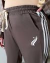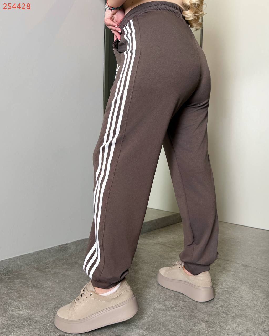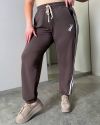 Жіночі штани спортивного типу прямого вільного крою , середньої посадки, пояс на резинці з виведеним шнурком для регулювання об’єму. З кишенями, по бокових швах – подвійні контрастні лампаси.