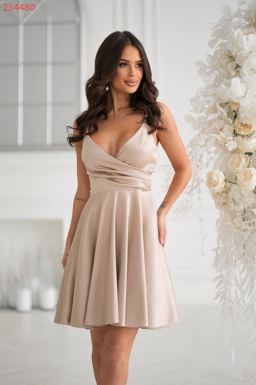 Атласна сукня з довжиною вище колін, розкльошеною спідницею «сонце», з подвійними брителями