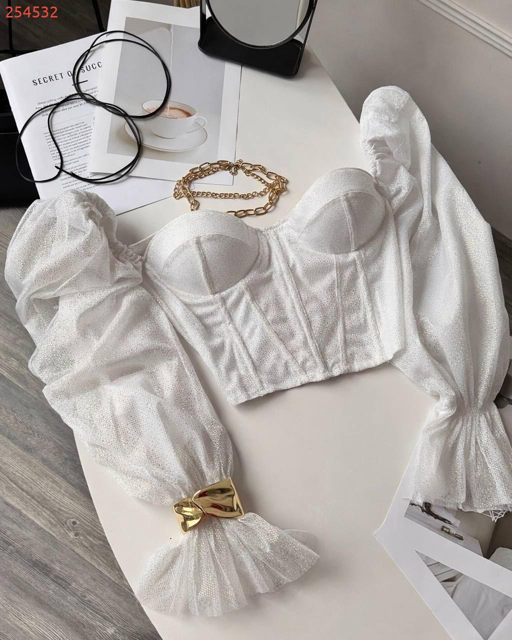 Неймовірно сяючий топ - бюстʼє з імітацією корсету та спущеними пишними рукавами. Тримає форму. Спинка йде на змійці.