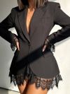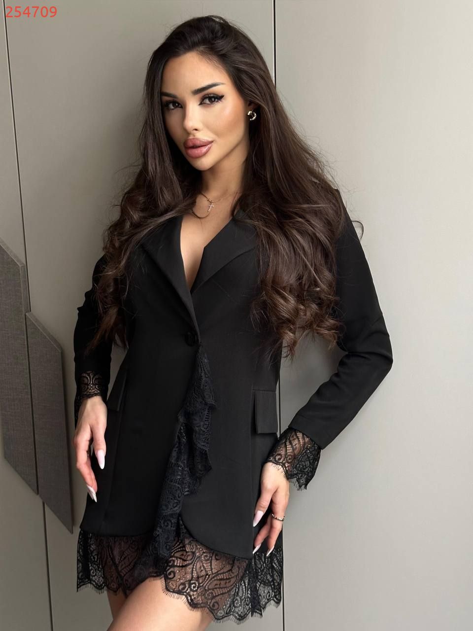 Розкішне плаття-піджак у класичному чорному кольорі, створене для особливих виходів. Модель виконана з щільної костюмної тканини та доповнена дорогим італійським мереживом по низу та на рукавах, що надає образу жіночності й вишуканості.