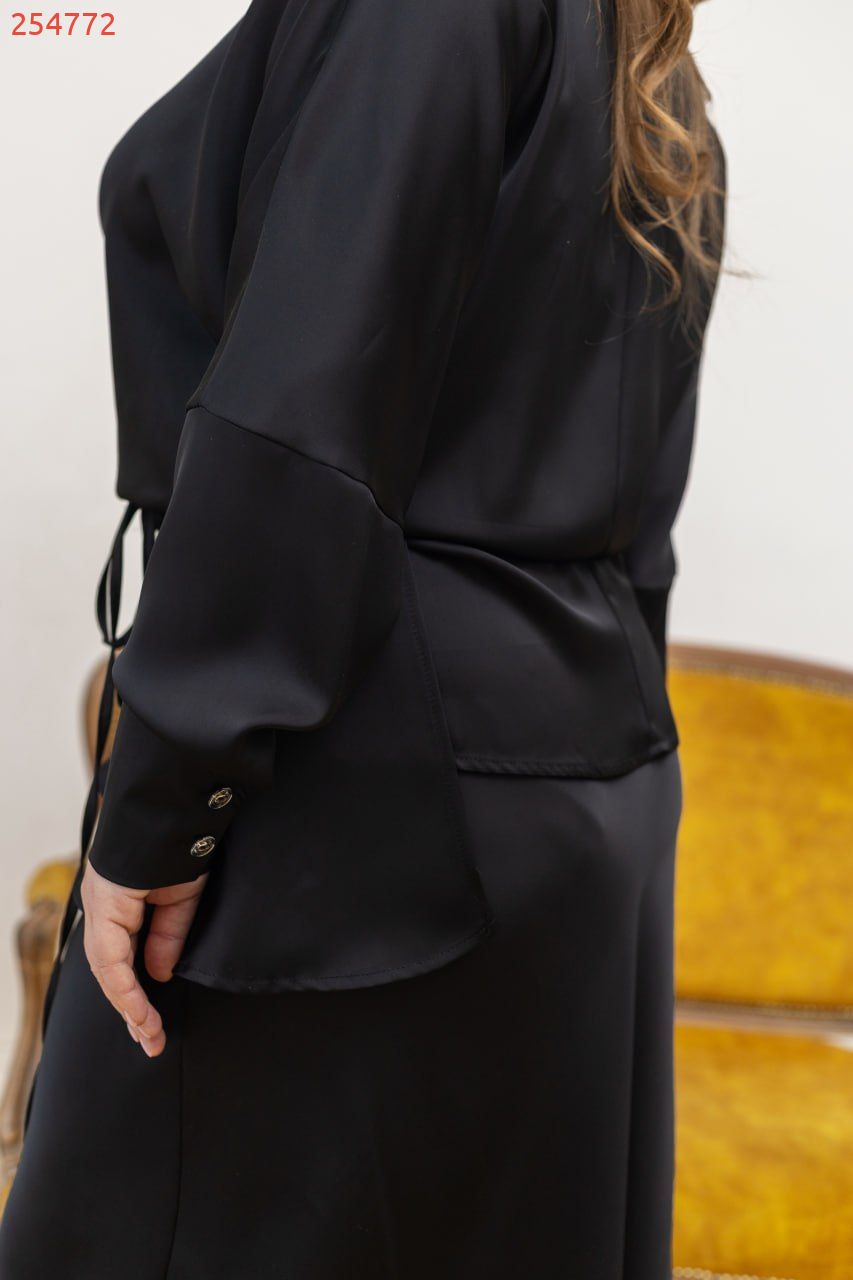 Тканина – гладкий шовк із благородним сатиновим блиском, який красиво переливається при русі та підкреслює кожен вигин. Ідеальний варіант для святкових подій, вечері або особливого виходу, коли хочеться виглядати жіночно й впевнено