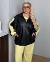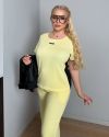 Футболка зі вставками чорної рібани по бокам ,що робить її комфортною та зменшує талію візуально.