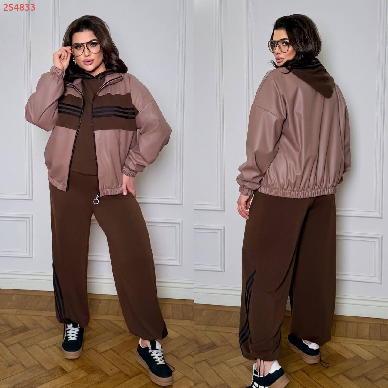 Кофта прямого покрою низ на фіксаторі , капюшон з ломпасом . Штани з ломпасами , з високою посадкою , пояс на гумці , з бічними кишенями , низ на фіксаторі .