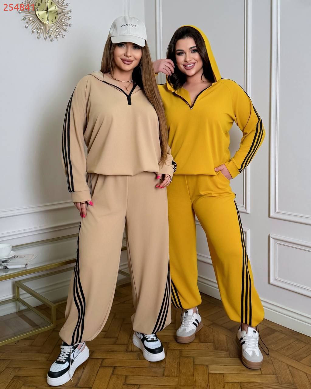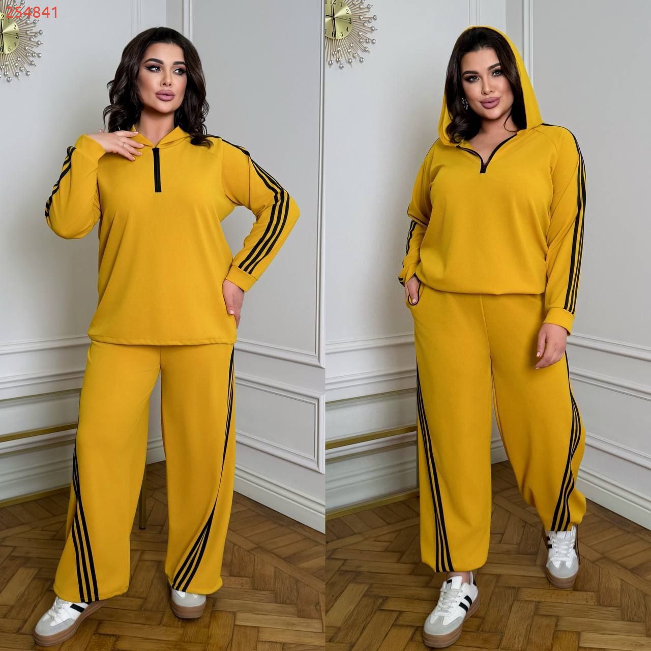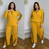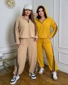 Довжина штанів : 106 см Штани з ломпасом , з високою посадкою , пояс на гумці , бічні кишені , низ на фіксаторі . Кофта прямого покрою низ на фіксаторі , з капюшоном на блискавці , рукав з ломпасом .