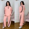 Довжина штанів : 106 см Штани з ломпасом , з високою посадкою , пояс на гумці , бічні кишені , низ на фіксаторі . Кофта прямого покрою низ на фіксаторі , з капюшоном на блискавці , рукав з ломпасом .