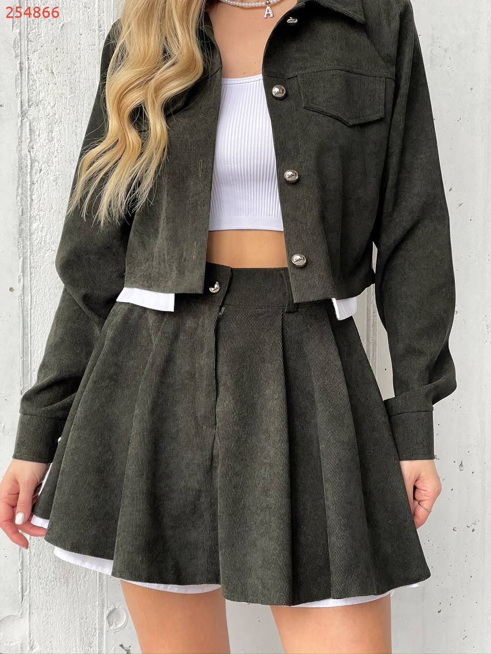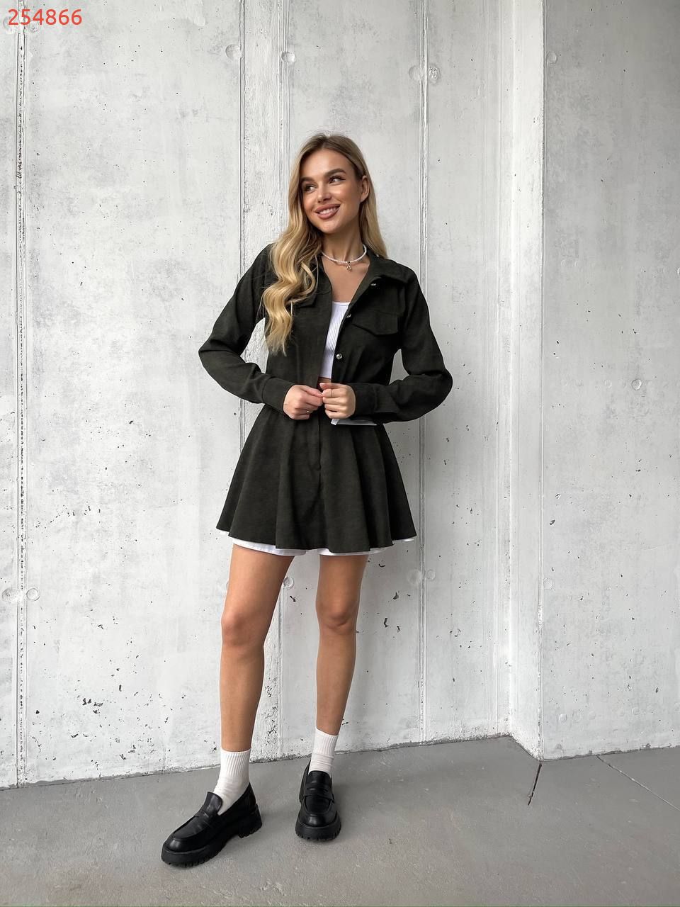 Костюм (жакет та спідниця-шорти) хакі №254866