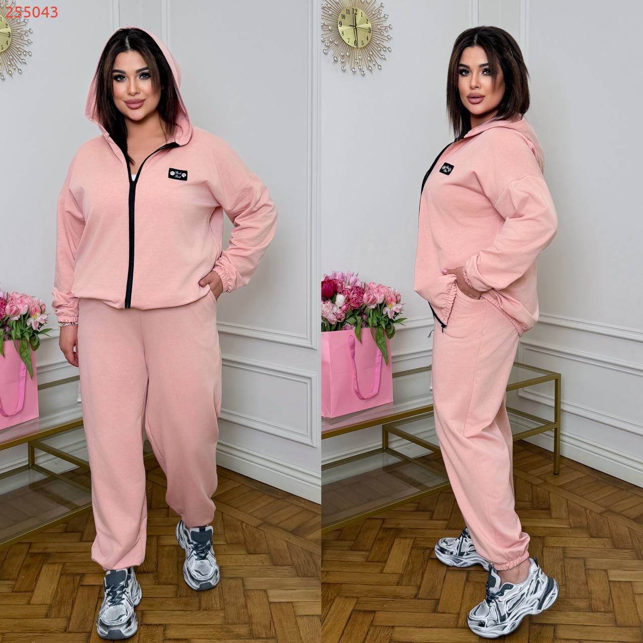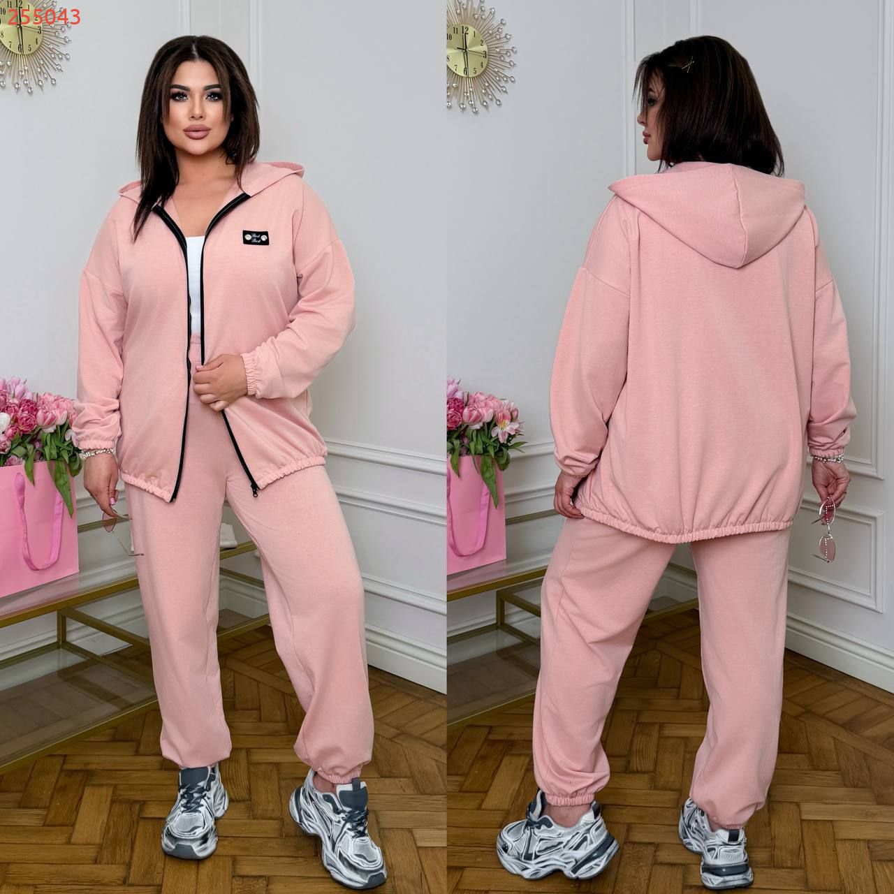 Довжина штанів : 106 см Штани з високою посадкою , пояс на гумці , бічні кишені , низ на гумці . Кофта прямого покрою , з капюшоном , на блискавці , низ та рукав на гумці