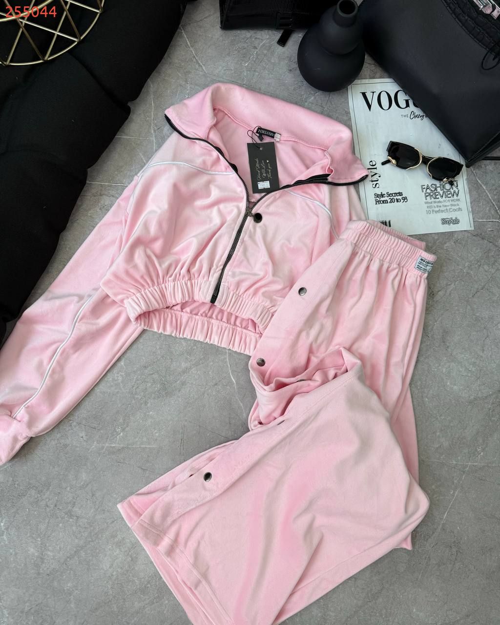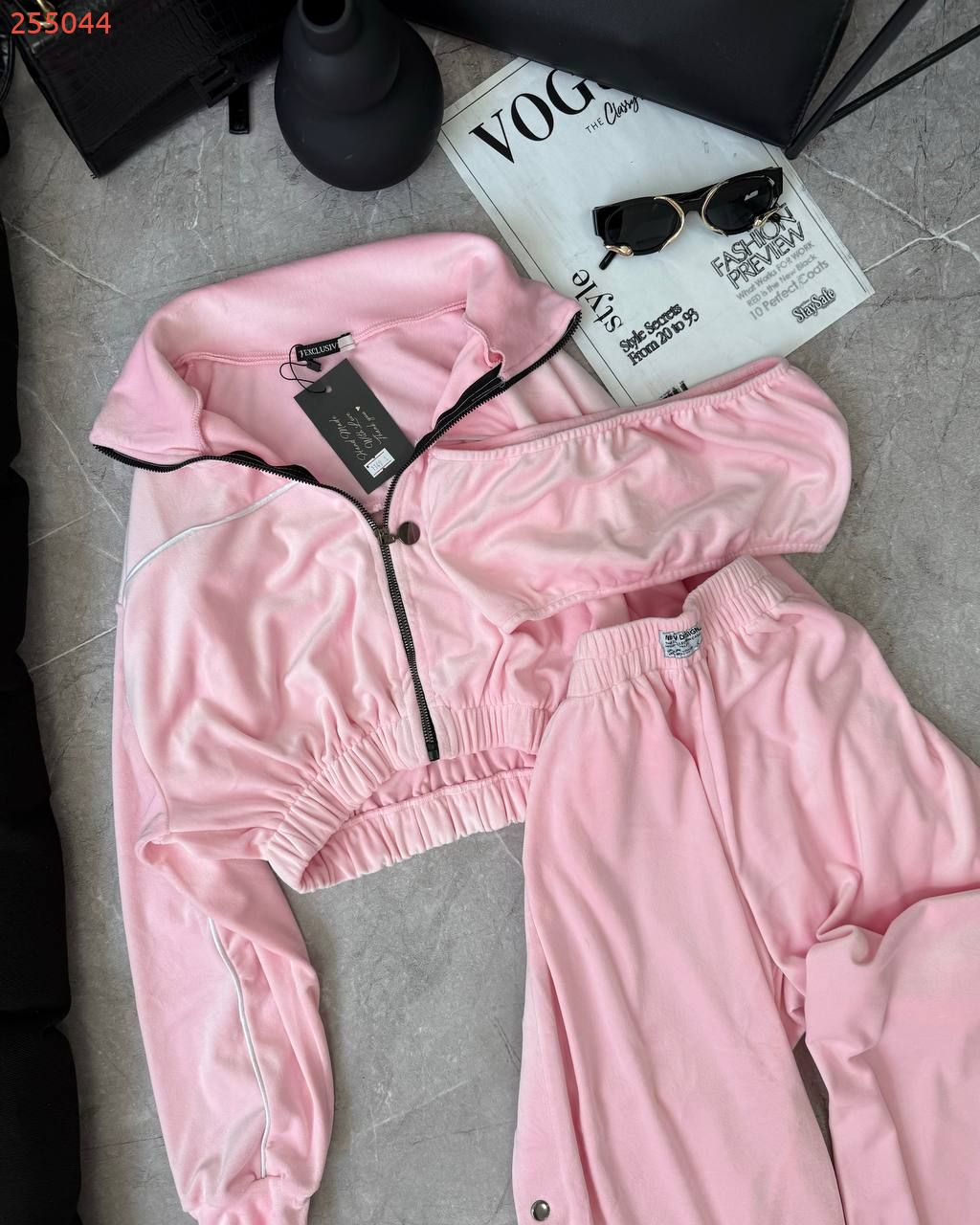 Ідеальний костюм з приємного мʼякого велюру. Складається з кофти, топу бандо та штанів на закльопках по боках. Кофта йде вкорочена на змійці, з кантом. Топ на резинці.