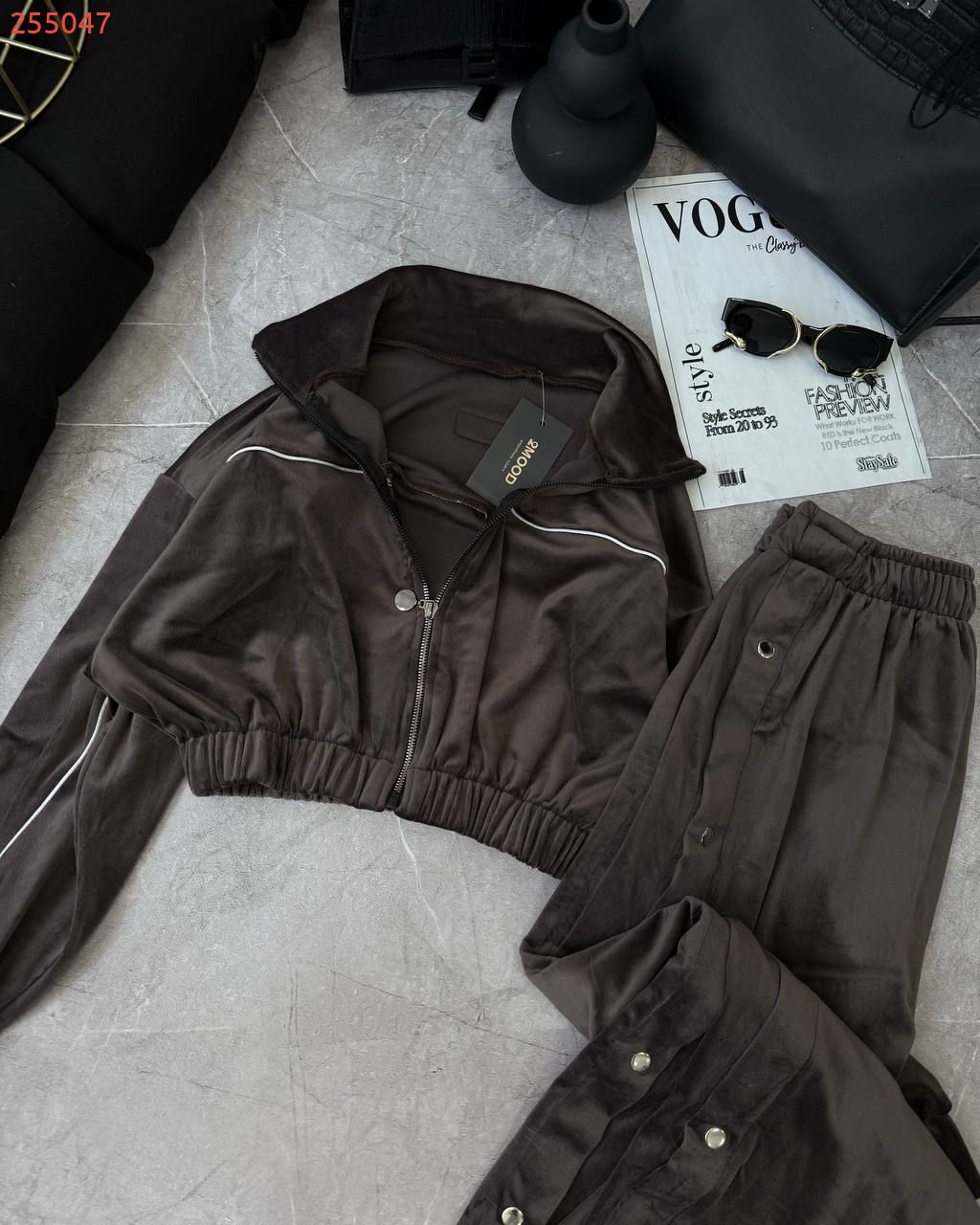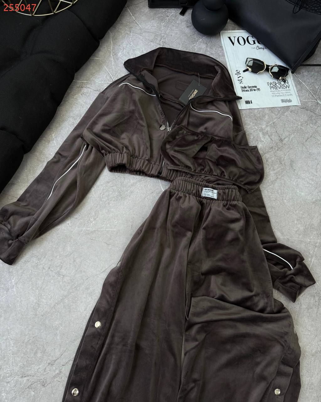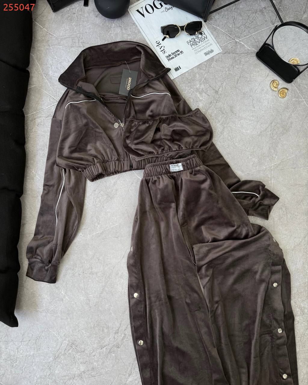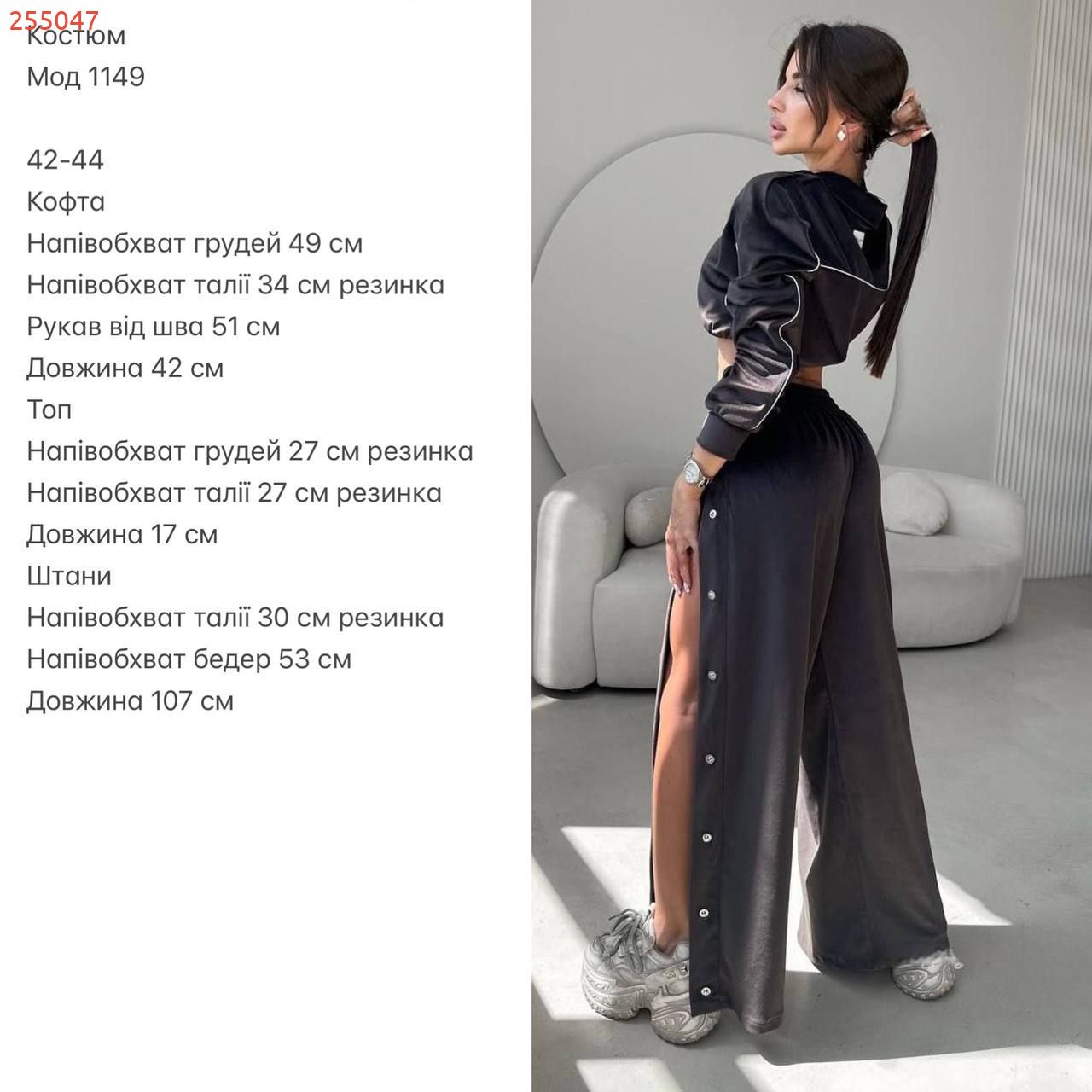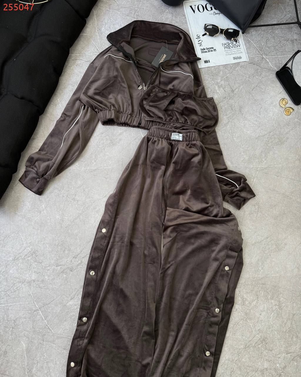Ідеальний костюм з приємного мʼякого велюру. Складається з кофти, топу бандо та штанів на закльопках по боках. Кофта йде вкорочена на змійці, з кантом. Топ на резинці.