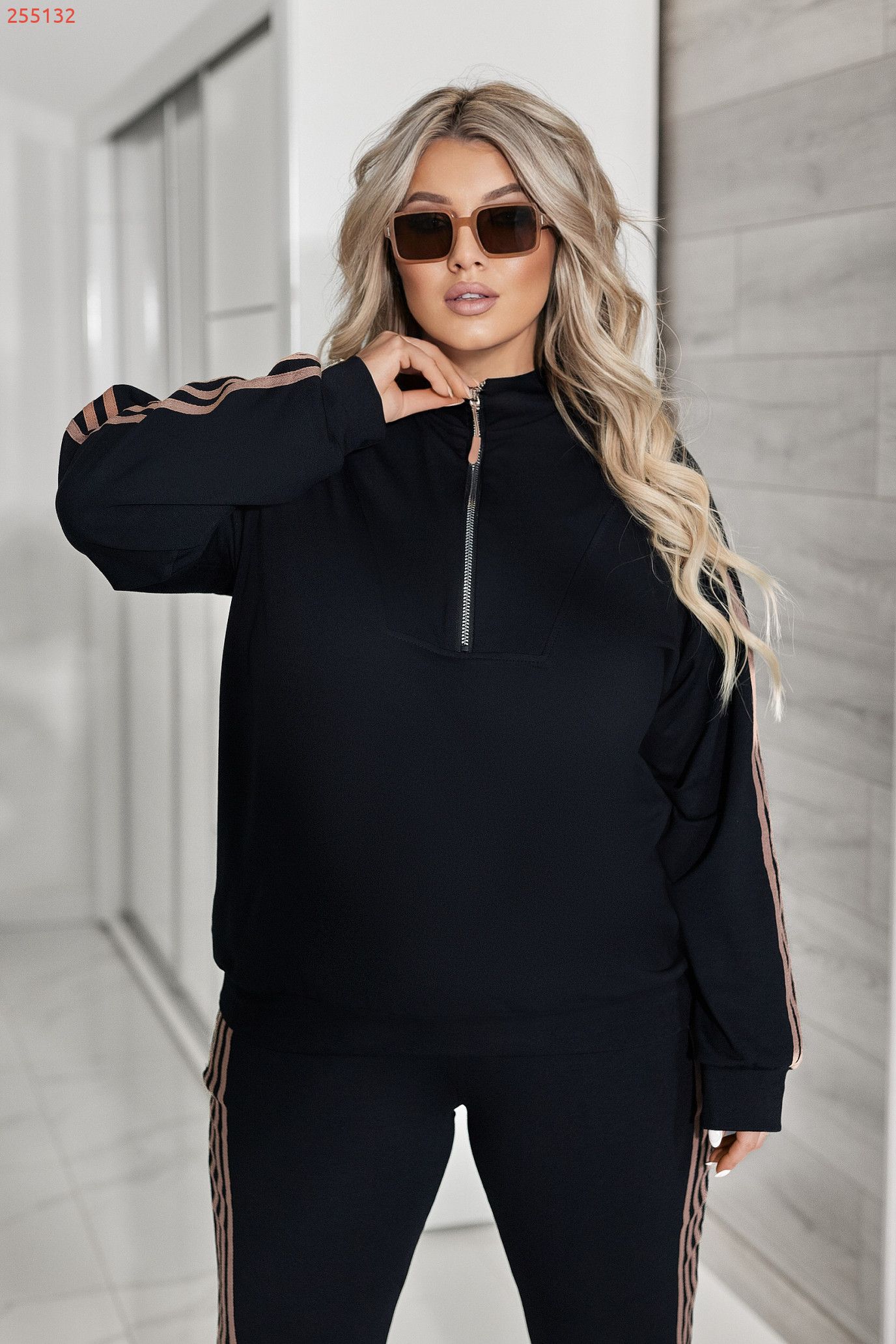 Кофтинка вільного покрою зі стійкою комірцем та блискавкою— зручна та сучасна. Модель декорована лампасами, які підкреслюють спортивний та модний стиль.