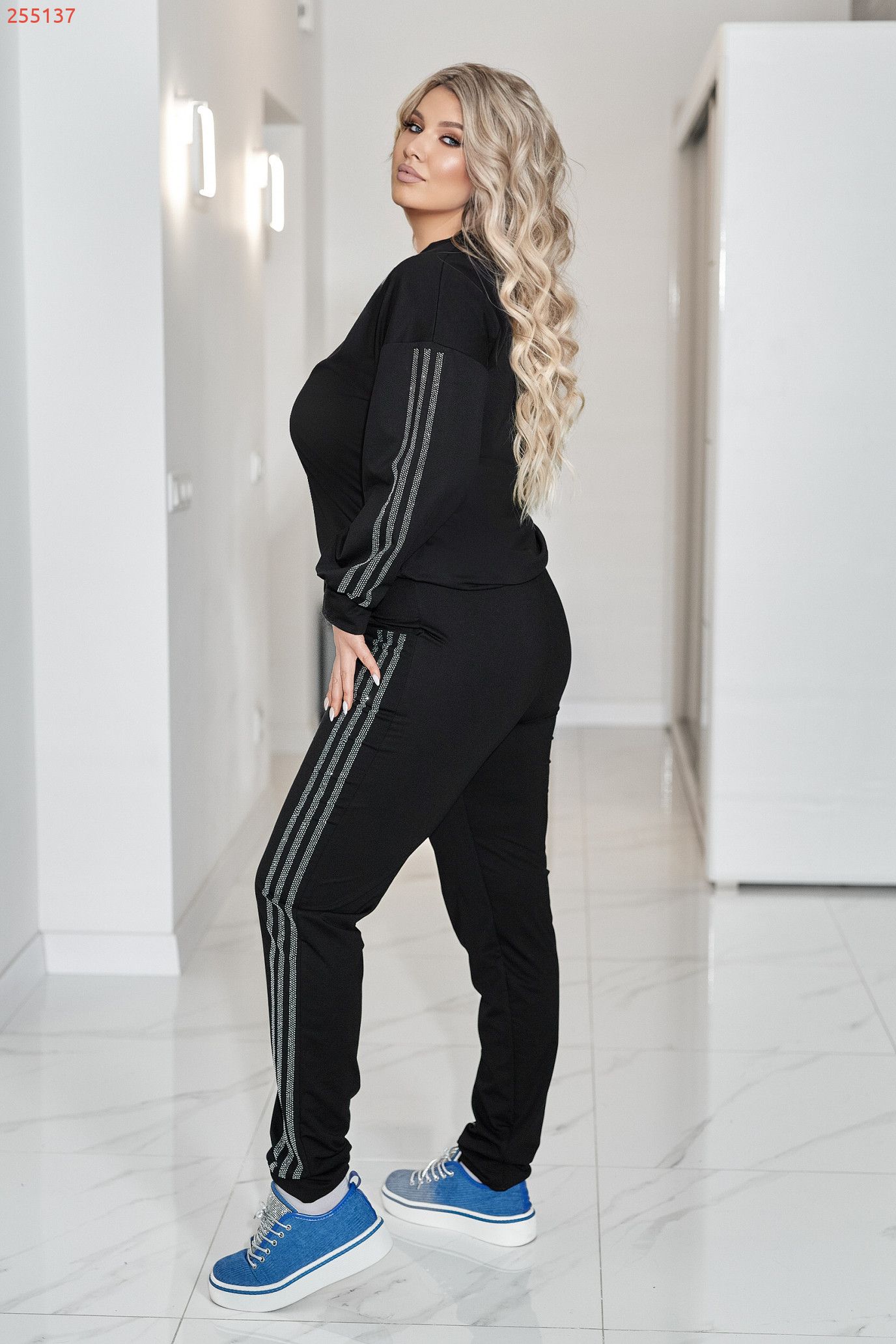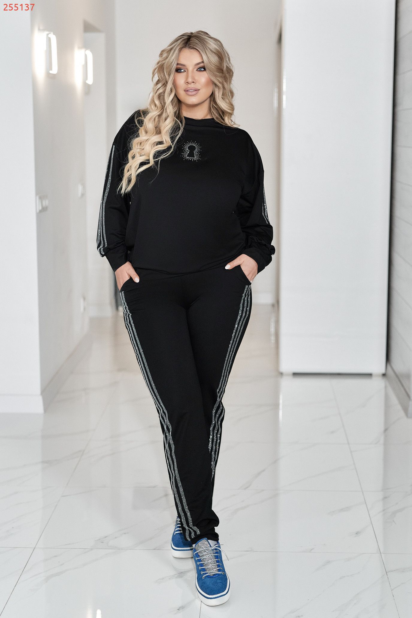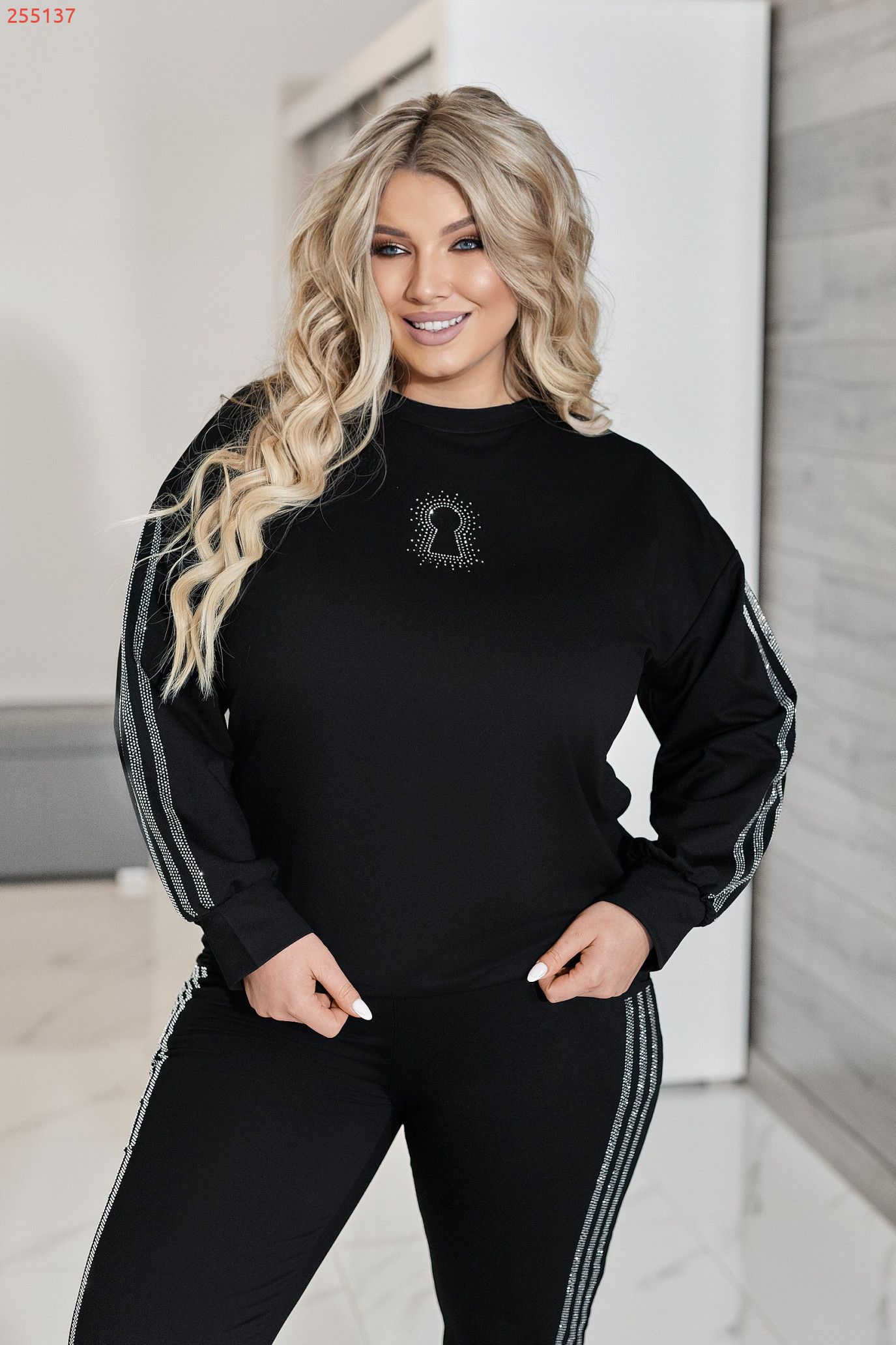 Комфортний та ефектний костюм із двухнитки чудової якості, прикрашений лампасами та візерунком " замок" зі страз.
