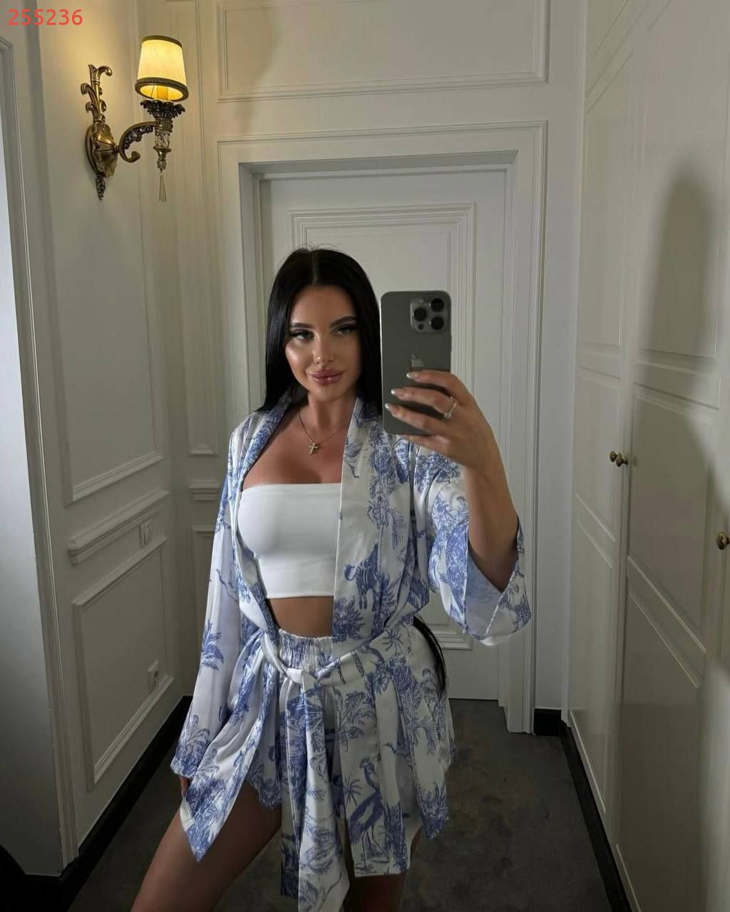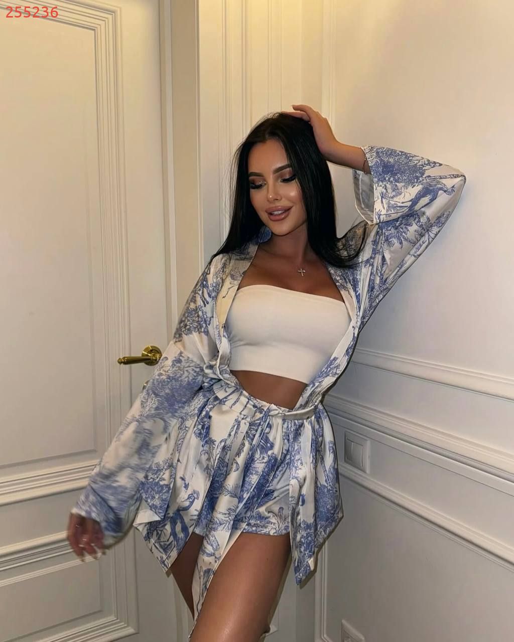 Цей костюм трійка знахідка на літо - кімоно з поясом + топ + шорти. Легка приємна до тіла тканина, не просвічується. Топ гарно тягнеться та сідає по фігурі. Шорти на резиночці, з розрізами.