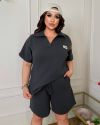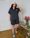 футболка поло у стилі оверсайз + шорти з високою посадкою з кішенями у бічних швах, з куліскою на поясі)
