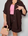 Стильний прогулянковий костюм з креп софту: Сорочка на гудзиках з кишенею , по низу з розрізами по боках + шорти з високою посадкою на гумці, з кишенями у бічних швах