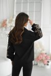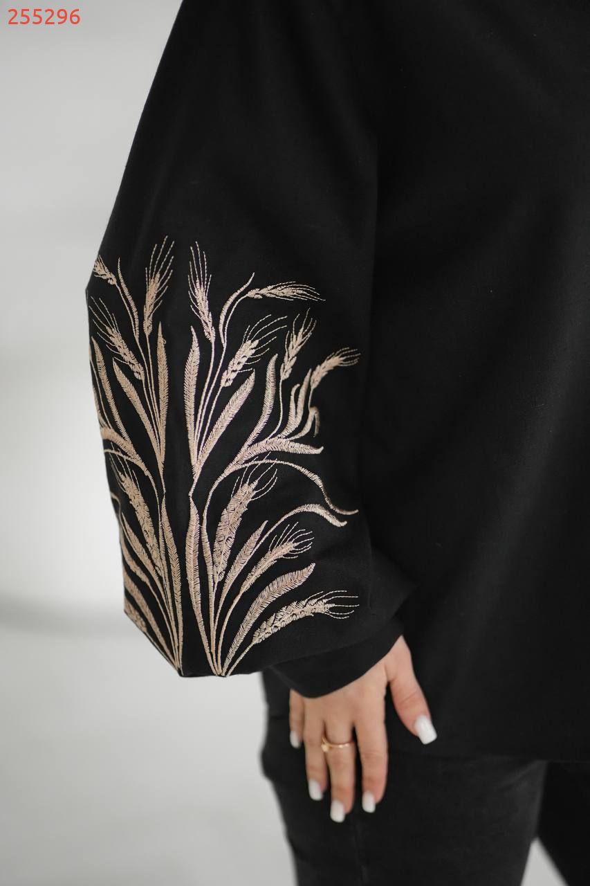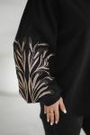 Лаконічний крій доповнений витонченою вишивкою у теплих бежево-золотистих відтінках, що створює ефект дорогого та вишуканого образу:
