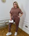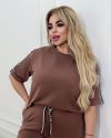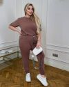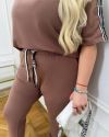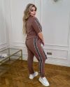 Весняно-літній костюм, футболка + штани, футболка з коротким рукавом і лампасами по рукавах. Штани джогери з кишенями на гумці, в поясі є шнурок, внизу манжета, лампаси з боків