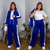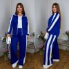 Стильний костюм трійка : кофта + футболка + штани . Футболка прямого покрою , кофта на блискавці , рукав з ломпасом . Штани з ломпасом , високою посадкою , пояс на гумці , з бічними кишенями .