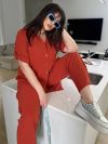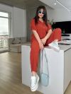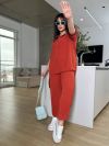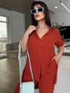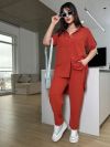 Костюм складається з штанів та сорочки. Штани мають прямий крій та комфортну посадку з гумкою на талії та манжетам. Сорочка вільного фасону з короткими рукавами та застібкою на гудзики. Стильний і сучасний комплект, що чудово підходить для повсякденного гардеробу.
