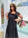 Стильна літня сукня. Сукня максі-довжини, вільного крою з завищеною талією. Верх має квадратний виріз і короткі рукави-ліхтарики з перфорованої тканини.