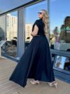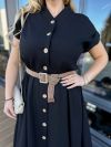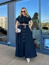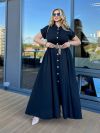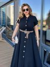 Сукня довга, виконана в стилі сорочки. Має короткі рукави з відворотами, круглий комір-стійку та застібку на гудзики по всій довжині. Талія підкреслена ременем. з металевою пряжкою. Вільний крій і легка тканина роблять сукню комфортною та універсальною для літнього гардеробу