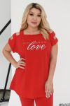 Кофта вільного крою з відкритими плечима прикрашена декоративними розрізами на лямках. Штани довжиною до середини ікри, що облягають, з еластичного матеріалу.