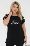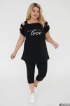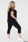Кофта вільного крою з відкритими плечима прикрашена декоративними розрізами на лямках. Штани довжиною до середини ікри, що облягають, з еластичного матеріалу.