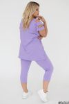 Кофта вільного крою з відкритими плечима прикрашена декоративними розрізами на лямках. Штани довжиною до середини ікри, що облягають, з еластичного матеріалу.