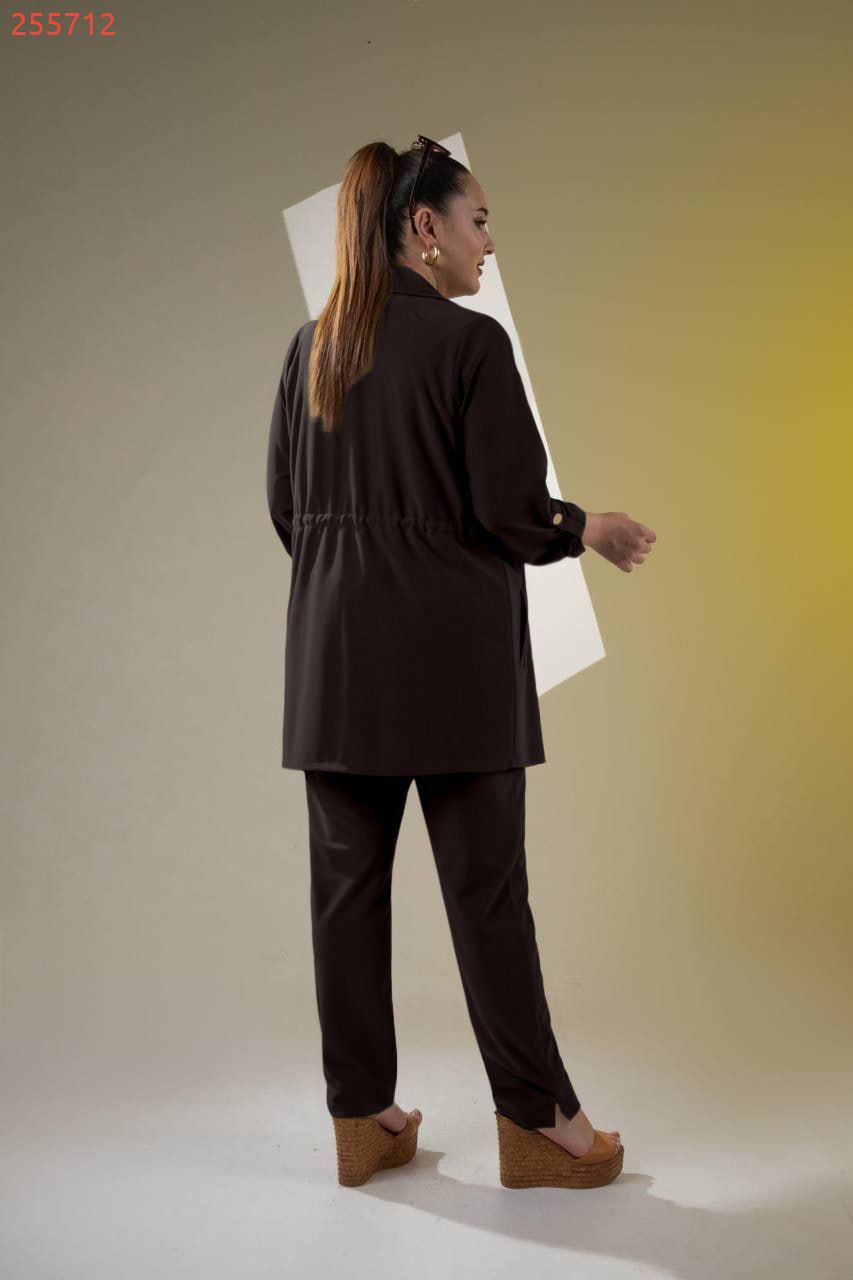 Костюм -трійка : подовжена кофта на ґудзиках , на грудях робочі кишені з ґудзиком , з боків кишені, довгий рукав на патіку ( можна регулювати довжину ), талія фіксується куліскою ( можна регулювати обʼєм ) . Штани на резинці , з боків кишені , по низу збоку розрізи . Футболка з якісним накатом ( не полиняє , не потріскає) , рукав до ліктя.
