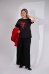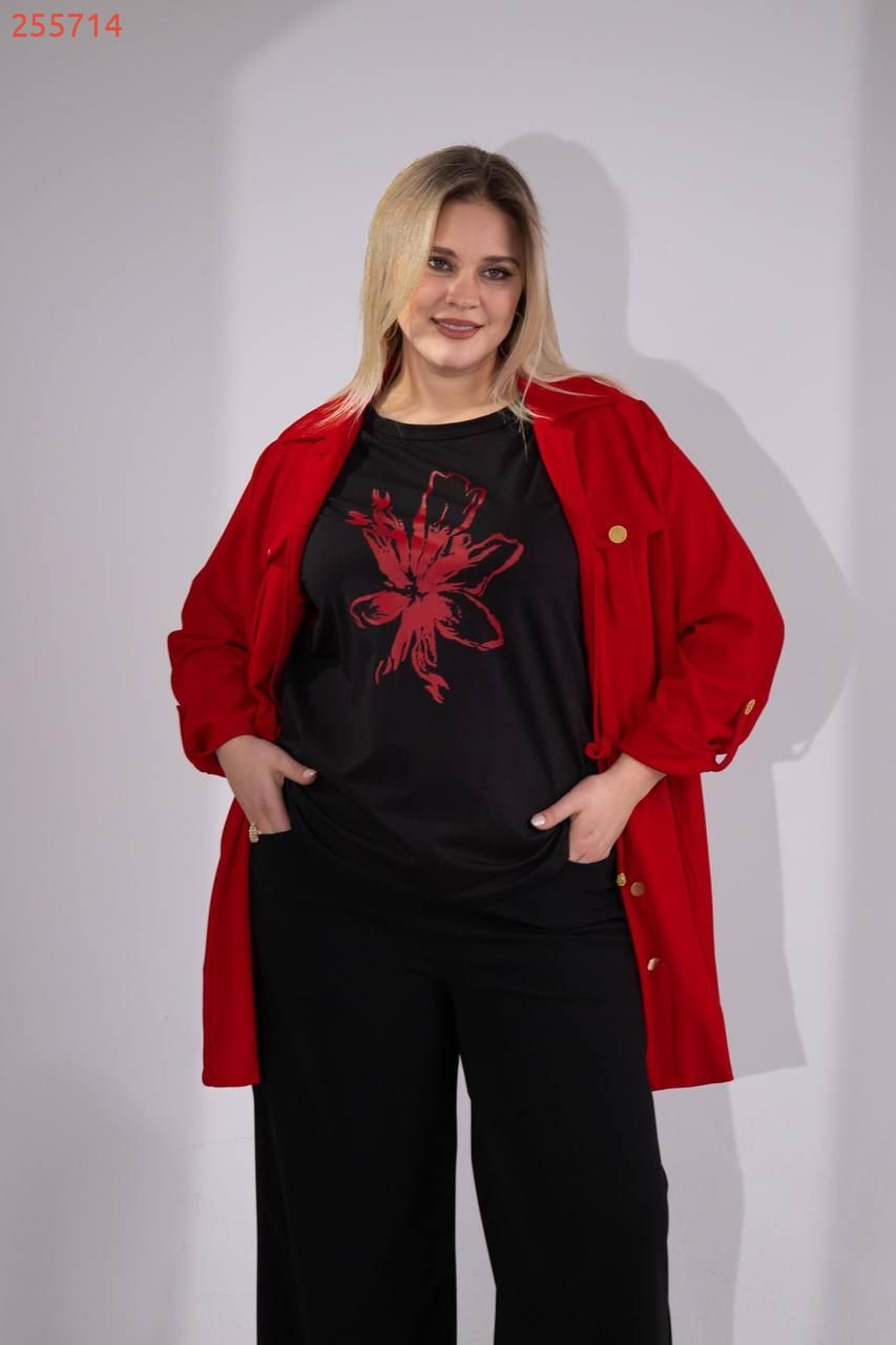 Костюм -трійка : подовжена кофта на ґудзиках , на грудях робочі кишені з ґудзиком , з боків кишені, довгий рукав на патіку ( можна регулювати довжину ), талія фіксується куліскою ( можна регулювати обʼєм ) . Штани на резинці , з боків кишені , по низу збоку розрізи . Футболка з якісним накатом ( не полиняє , не потріскає) , рукав до ліктя.