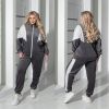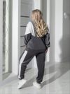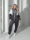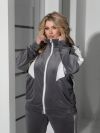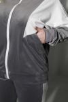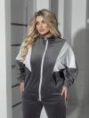 Комфортний та сучасний костюм із м'якого велюру гарної якості. Тканина приємна до тіла, гарно виглядає та має чудово розтяжність . Кофтинка вільного крою з білими вставками та з кишенями. Штани с кишенями та лампасами, низ штанів на манжетах . Костюм підійде як для прогулок так для повсякденного носіння.