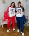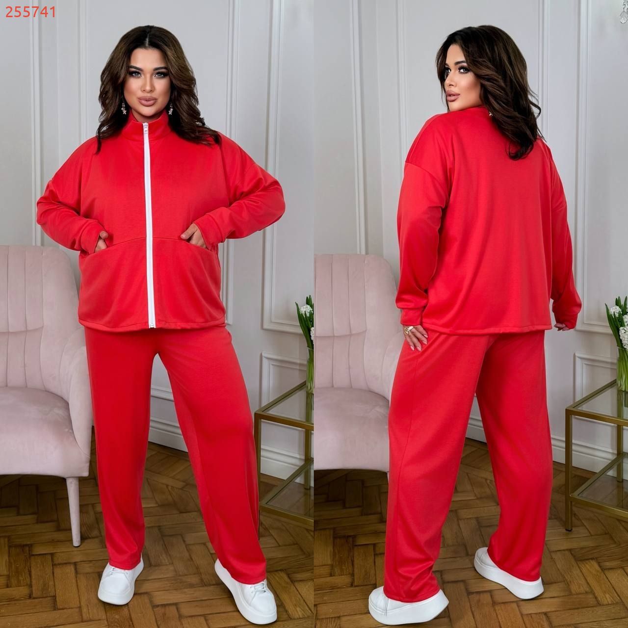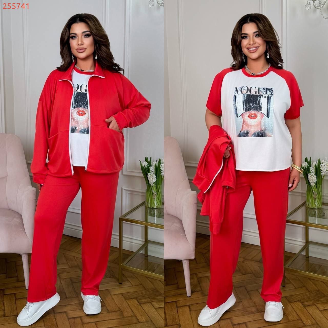 Стильний костюм трійка : кофта + футболка + штани . Футболка прямого покрою , кофта з стійкою на блискавці , з кишенями , низ на фіксаторі . Штани з високою посадкою , пояс на гумці , з бічними кишенями .