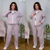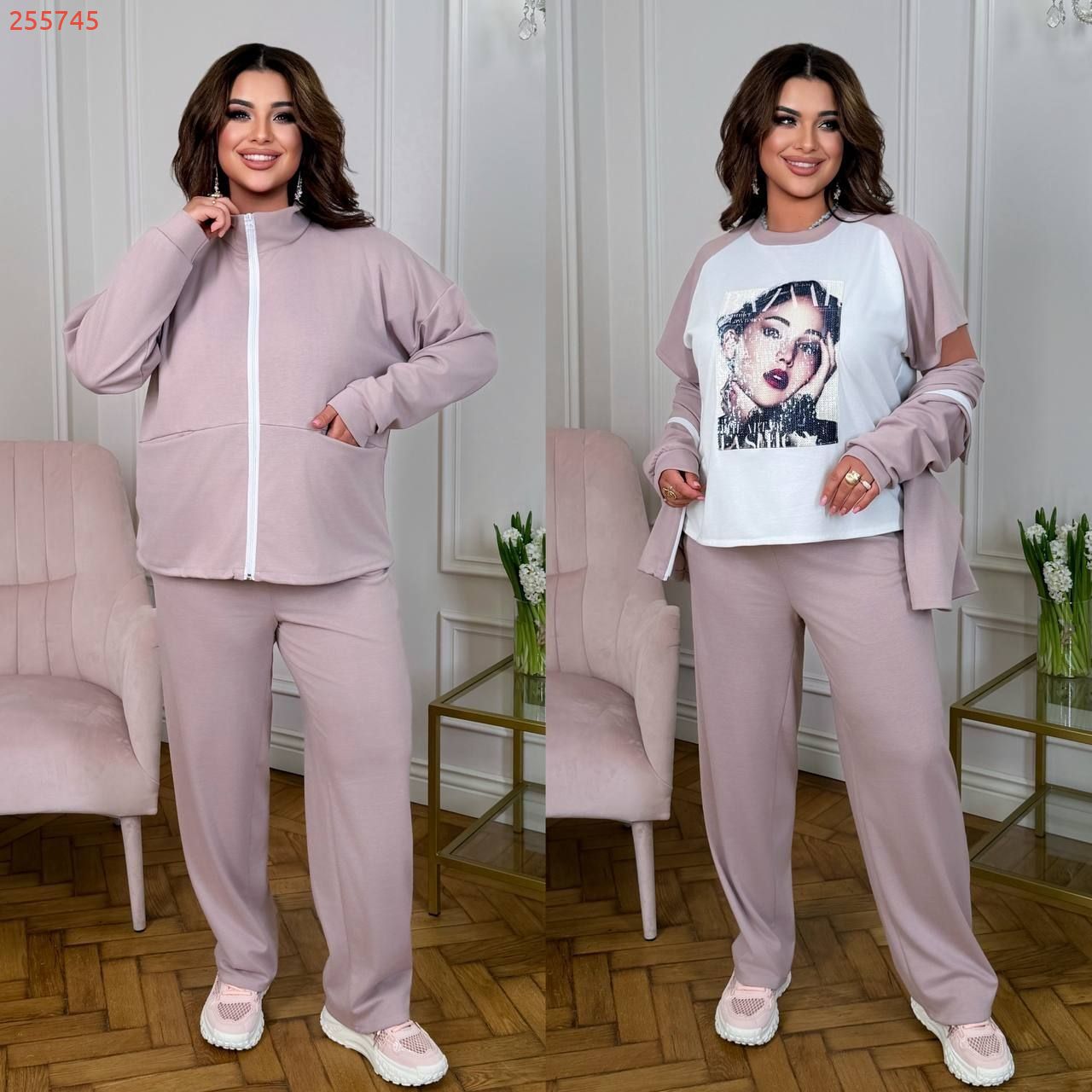 Стильний костюм трійка : кофта + футболка + штани . Футболка прямого покрою , кофта з стійкою на блискавці , з кишенями , низ на фіксаторі . Штани з високою посадкою , пояс на гумці , з бічними кишенями .