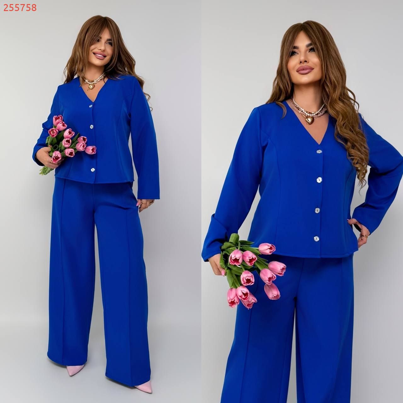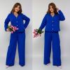 Штани з високою посадкою , пояс на гумці , бічні кишені , з переду стрілки . Піджак на ґудзиках з заду завʼязка .