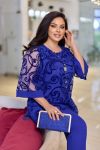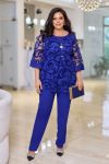 Комплект двох предметний, складається з блузки та штанів. У такому вбранні жінка виглядатиме елегантно, святково на будь-якій події. Блузка напівприлеглого силуету виготовлена ​​з флока на сітці. Горловина округлої форми. Полиця з нагрудними виточками. Рукав втічний, вільний 3/4. Штани злегка звужені донизу. Прекрасний вибір для вашого образу, який поєднує в собі красу та зручність.