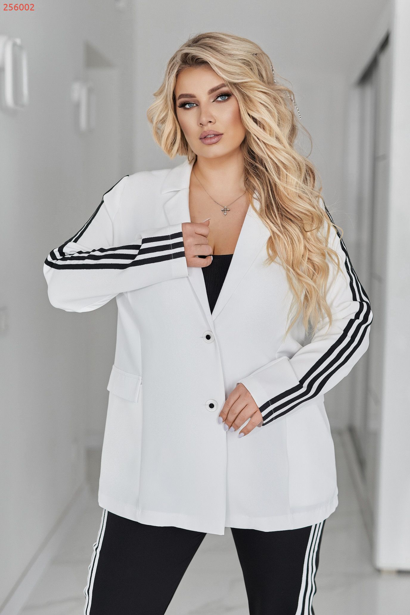 Рукава декоровані лампасами, що візуально витягують силует і додають динаміки образу.