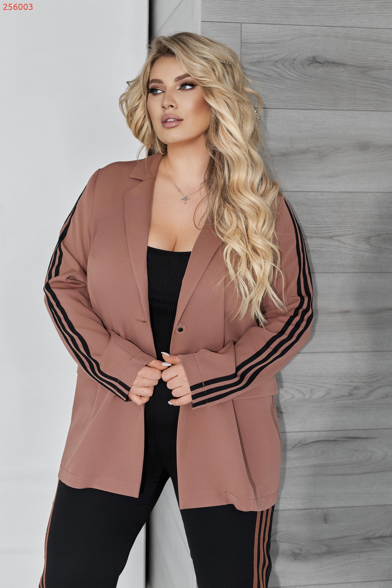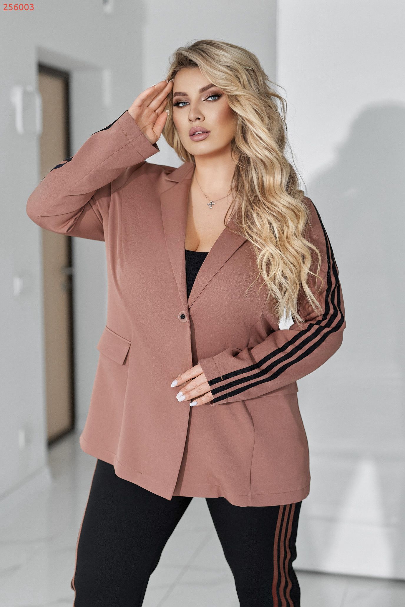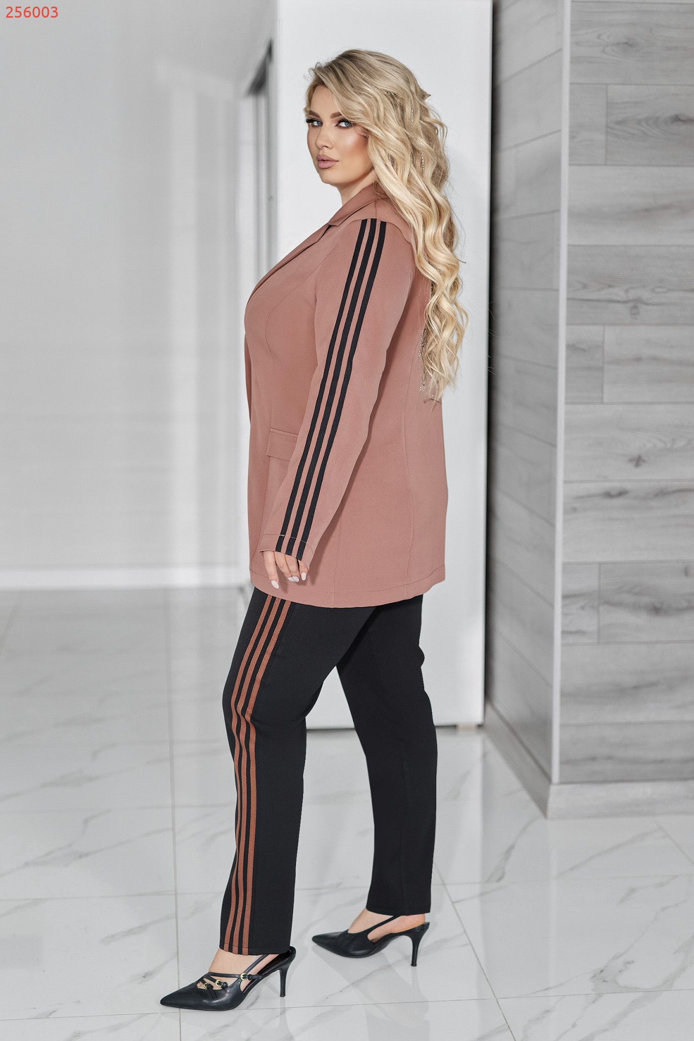 Рукава декоровані лампасами, що візуально витягують силует і додають динаміки образу.