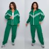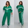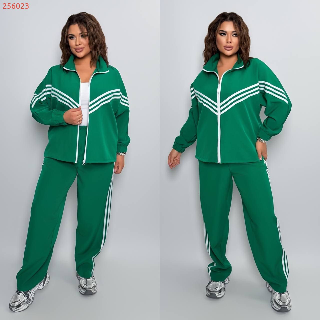 Штани з високою посадкою , пояс на гумці , бічні кишені , бічні ломпаси . Кофта прямого покрою з ломпасом на блискавці , комір стійка , низ на фіксаторі .