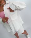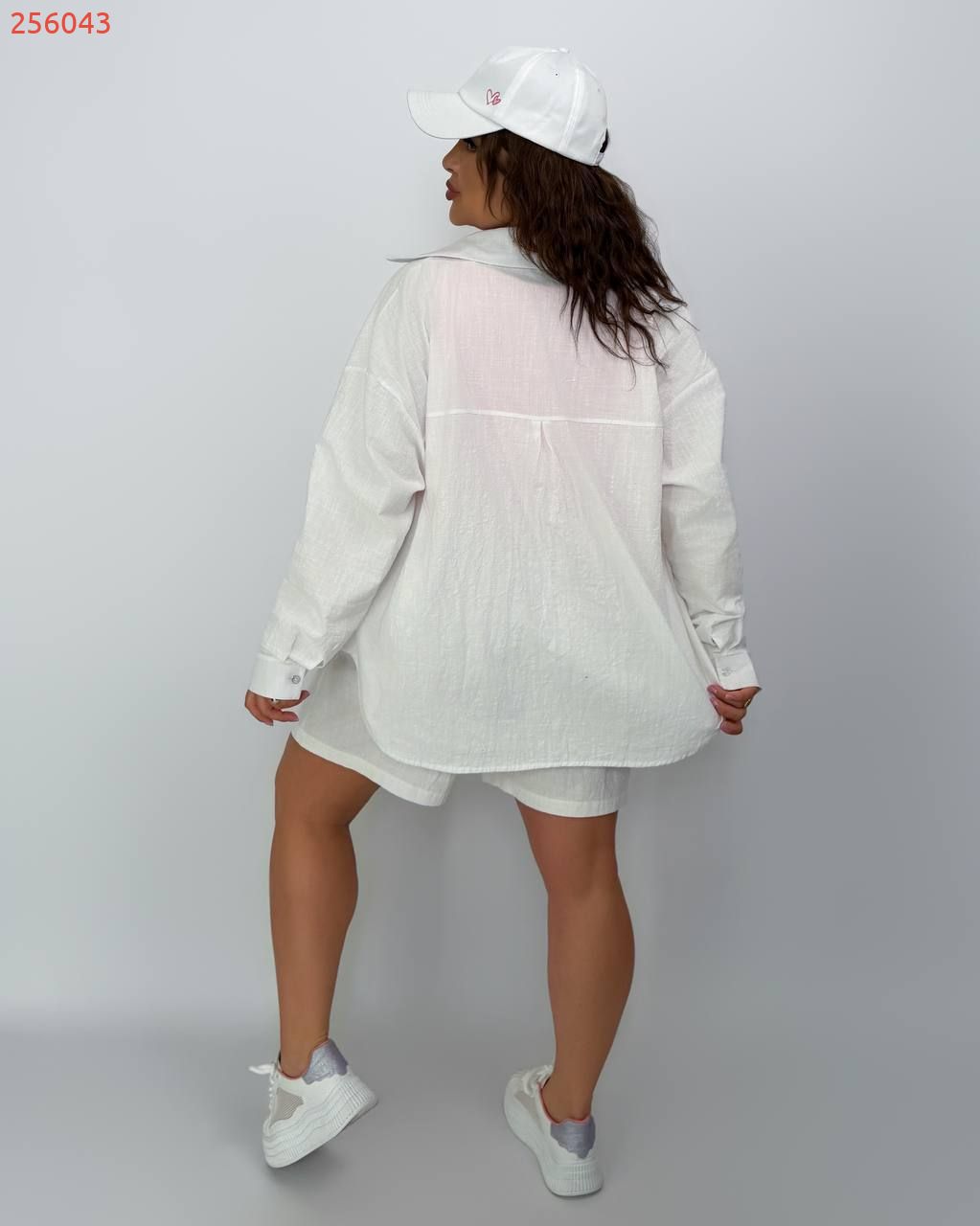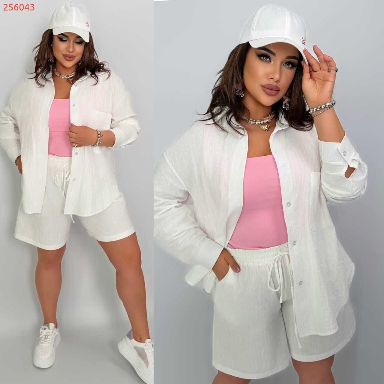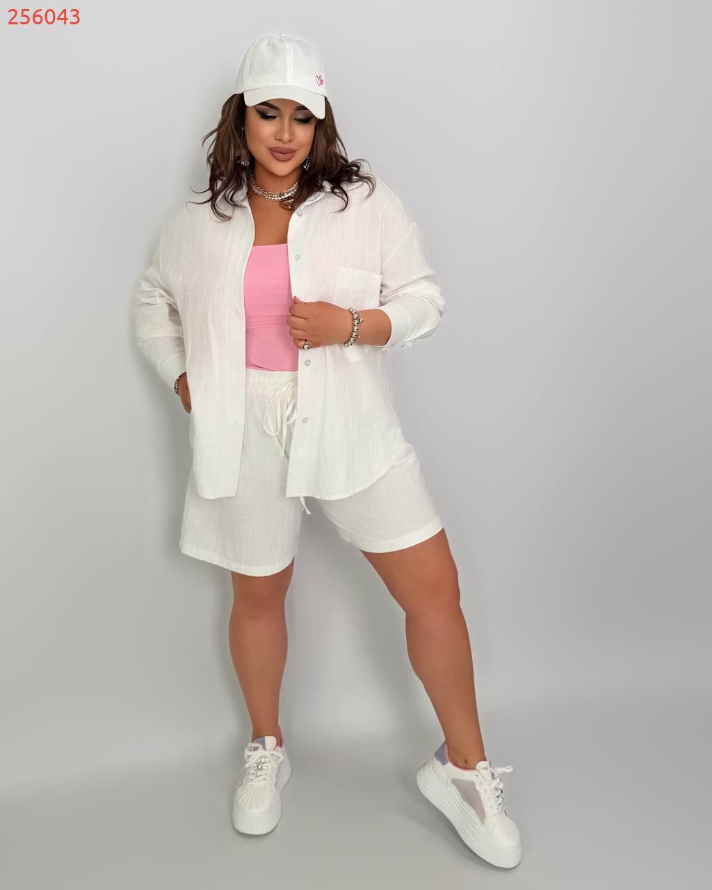 Костюм із жатого льону: сорочка на ґудзиках з карманом + шорти з кишенями у бічних швах з посадкою вище середнього на еластичній гумці та куліскою на поясі