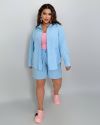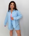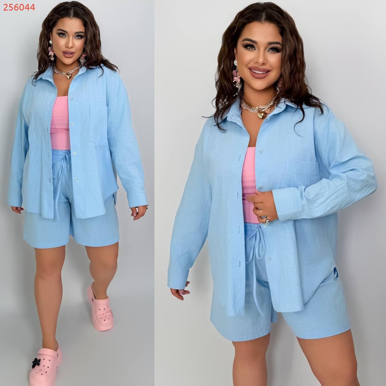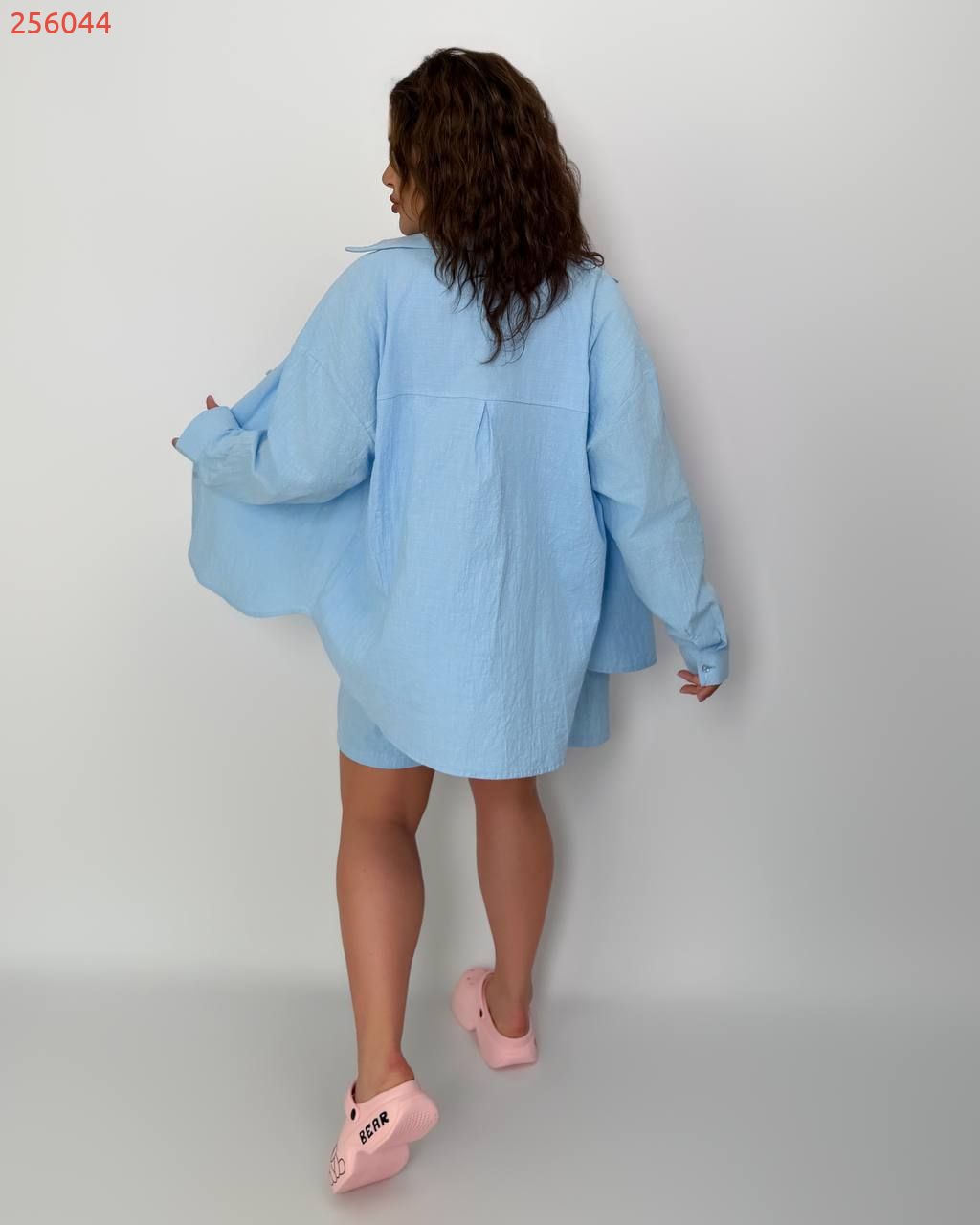 Костюм із жатого льону: сорочка на ґудзиках з карманом + шорти з кишенями у бічних швах з посадкою вище середнього на еластичній гумці та куліскою на поясі