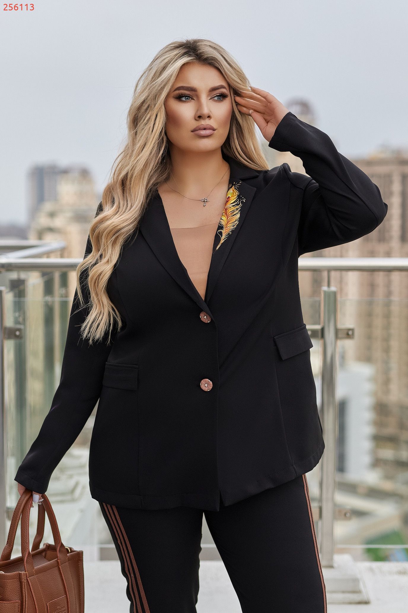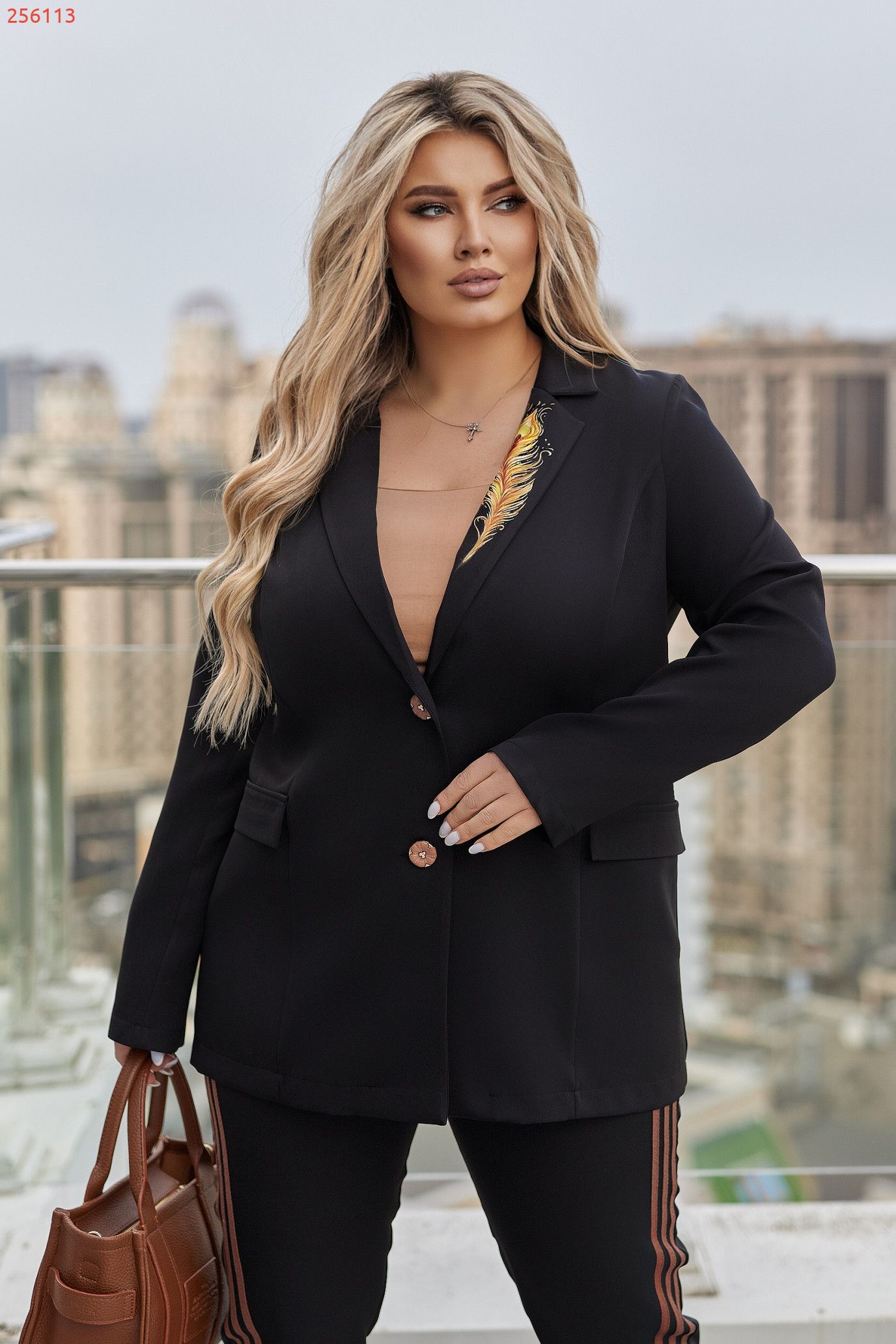 На лацкані — витончене перо, що гармонійно доповнює дизайн.