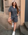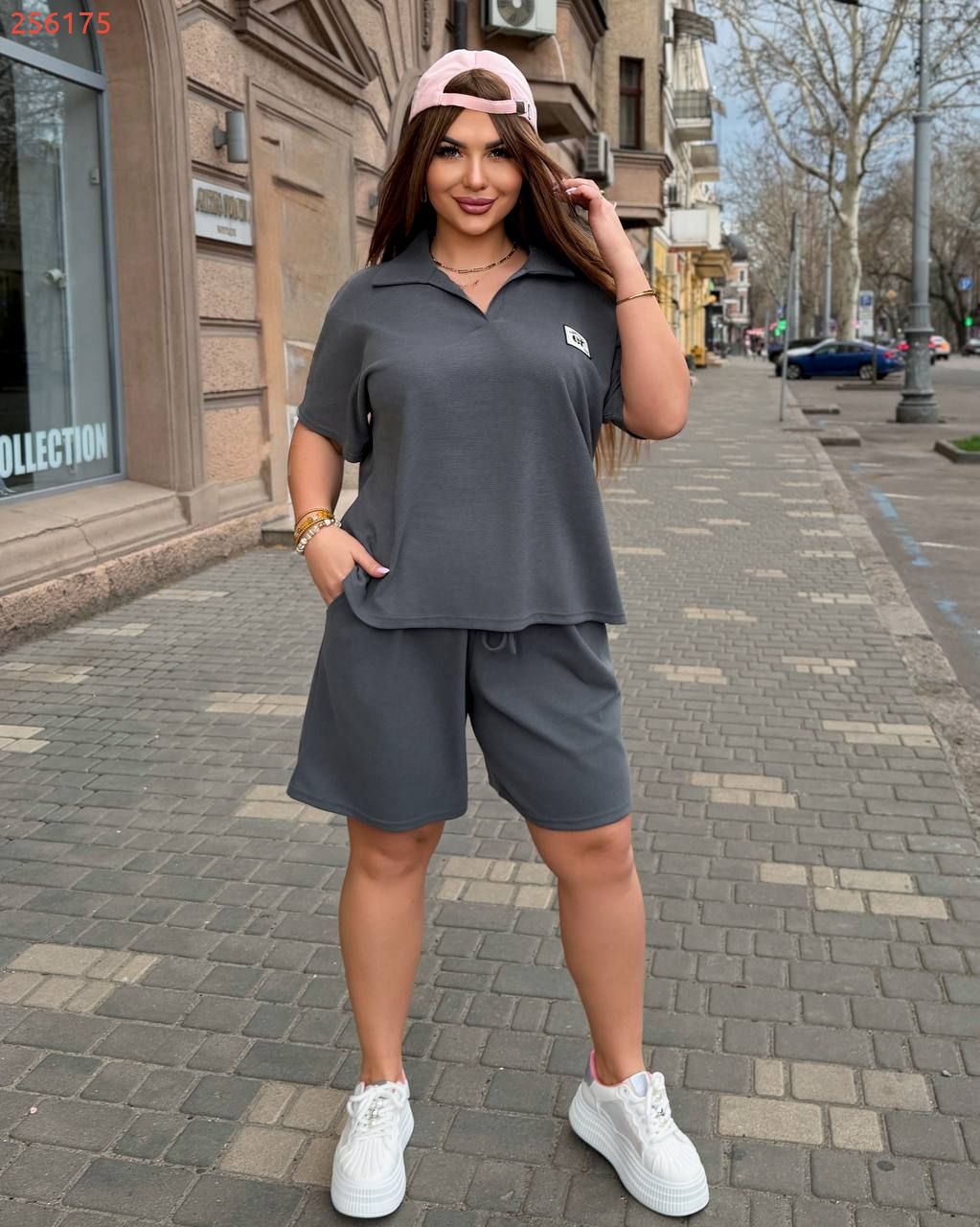 Стильний комфортний костюм з шортами з трикотажу еластан : футболка поло у стилі оверсайз з акс + шорти з високою посадкою з кішенями у бічних швах, з куліскою на поясі.